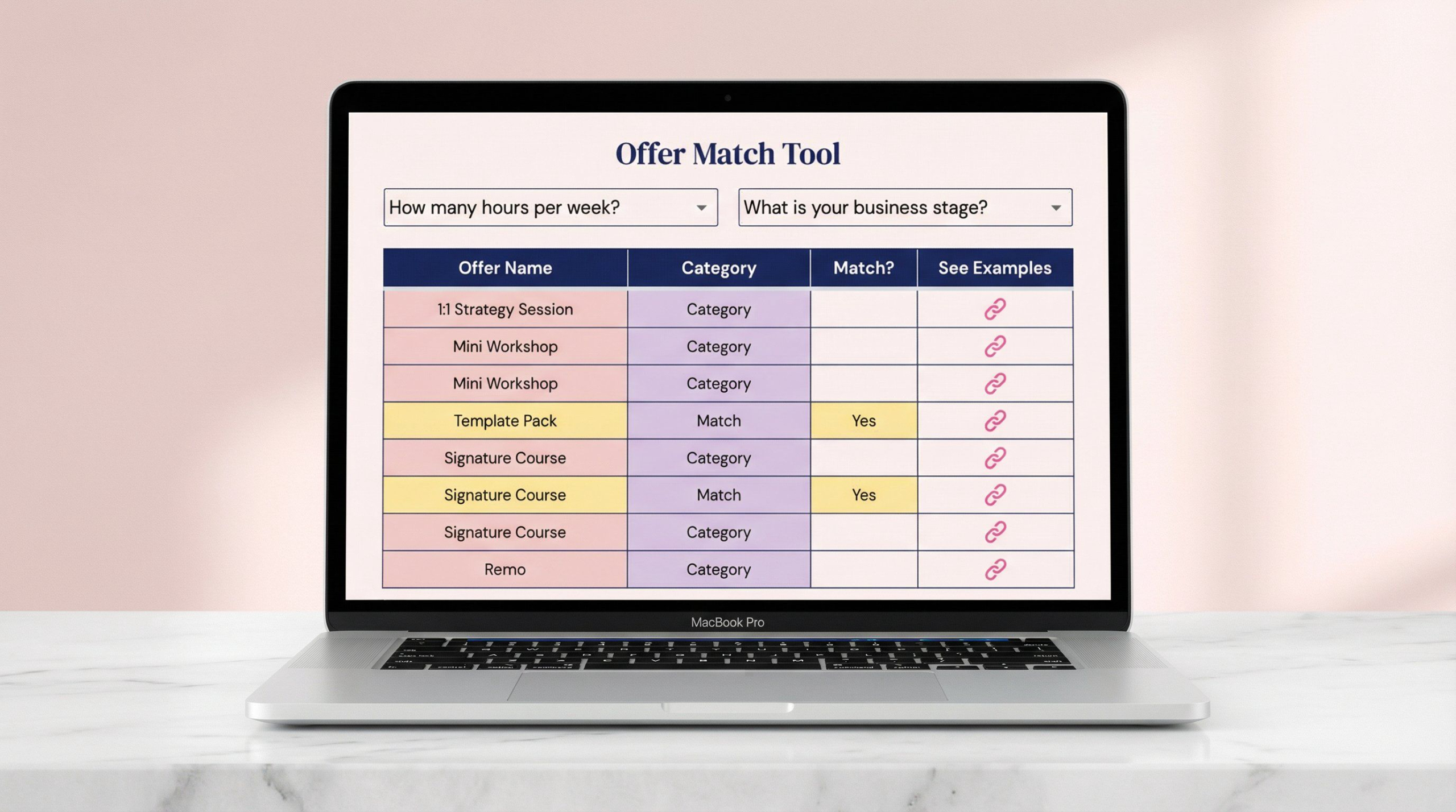 A zero-fluff, guided video training where I walk you through exactly what makes an offer work for you and your clients' needs. We will use the interactive Offer Match Tool -you simply input how many hours you have to work and your current business stage, and the tool instantly highlights your most profitable offer paths. It includes an Offer Inspiration Library with real-world examples for every single offer type, so you can see exactly what your chosen offer could look like.